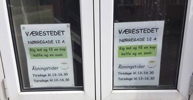 Det ændrer sig fuldstændigt tirsdag og torsdag eftermiddag. Mellem kl. 13:00 og 16:30 er der sat et flag og et skilt ud på Nørregade, der gør opmærksom på, at Værestedet er åbent og alle er velkomne. Døren ud til Nørregade er imidlertid låst, så man skal gå ind ad havegangen langs huset.