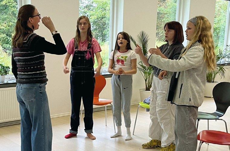 Vi synger flerstemmigt, laver kanondanse og fagter, der understøtter sangen. Vi lærer at bruge vores instrument, stemmen, på en sund og naturlig måde, og vi arbejder med rytme- og nodelære.