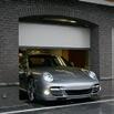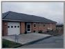 Hænger på cykelskur ud mod vejen til højre, når man kører ind i indkørslen.