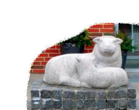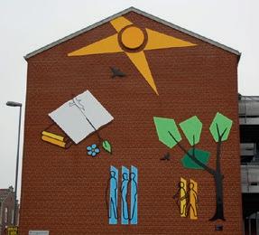 I kantinen på væggen ud til Vævervej, den kan ses fra vejen gennem terrassedør. Kun tilgængelig i åbningstiden.