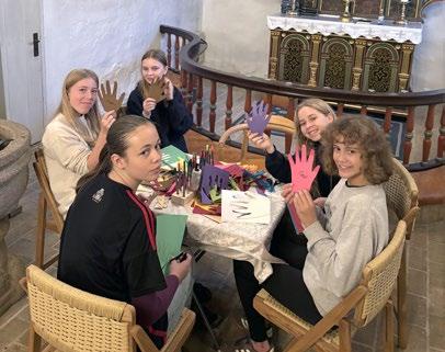 Konfirmanderne ved begge kirker er i fuld gang og tager imod præstens sjove indfald med højt humør – her er de i gang med morgenmad og krea i kirkerummet.