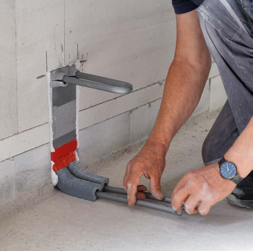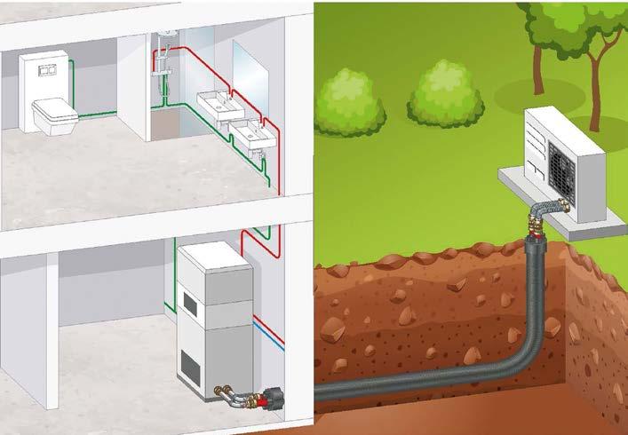 zu mehreren Querschnittsverengungen, was die Druckverluste erhöht. Ebenfalls häufig zu sehen ist, dass Vor- und Rücklauf im Erdreich in einem Kanalgrundrohr verlegt und die Enden sowie die Hauseinführung beispielsweise noch mit Montageschaum verschlossen werden. Die neuen Lösungen von Viega für den Wärmepumpenanschluss räumen mit all dem buchstäblich auf.