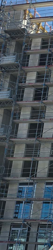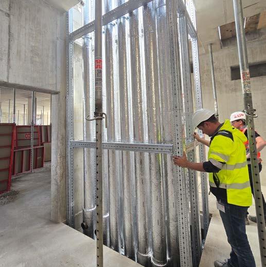 Ermöglicht wurde das vor allem durch die digitalen Projektund Systemdaten, die Generalübernehmer Ed. Züblin AG (Stuttgart) für das Gebäude und Viega für die Pressverbindersysteme bereitstellten. Auf dieser Basis entwickelte Befestigungsspezialist SIKLA (Villingen-Schwenningen) mit dem Tochterunternehmen PKT-Systeme GmbH (Mittenwalde) dann zwei insgesamt 29 m hohe Schachtmodule mit den Abmessungen 2,20 m x 1,60 m, die ein Kran nur noch in den Rohbau einsetzen musste.