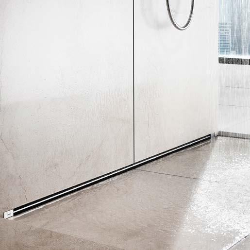 Linienentwässerung in der Dusche Bodengleiche Duschen ermöglichen einen schwellenlosen Zugang und erleichtern so die selbstbestimmte Badnutzung. Gestalterisch bieten sie gerade in der Kombination mit einer Linienentwässerung vielfältige Möglichkeiten. So erzielen Linienentwässerungen, die entweder direkt vor und auch in der Wand verlegt werden können, maximalen Komfort und eine stolperfreie Duschfläche. Dazu zählt etwa die Advantix Vario in puristischem Design mit einem nur 4 mm breiten Stegrost. Und bei der Variante Advantix Vario Wand ist lediglich eine Einbautiefe von 25 mm nötig. Beide sind variabel kürzbar und ermöglichen so noch mehr Gestaltungsfreiraum für ebenso schöne wie altersgerechte Bäder.
