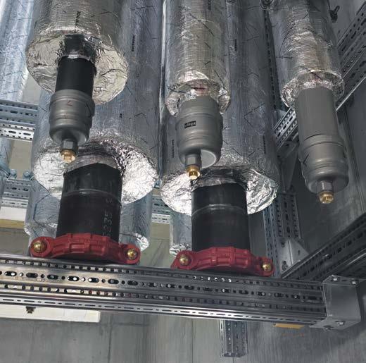 Die Schachtbelegung besteht aus jeweils 18 Rohrleitungen in den Dimensionen DN 32 bis DN 200 für Heizung, Kühlwasser, Kälte, Dampf und Regenwasser. Die Heizungsund die Kühlinstallationen wurden dabei bis DN 100 mit den Viega Pressverbindersystemen Megapress und Megapress S XL ausgeführt. PKT-Verkaufsleiter Johannes Ziegenbalg: „Der Vorteil ist, dass wir mit Megapress auch das für Heizungs- und Kühlanlagen typische dickwandige Stahlrohr kalt verpressen können. Beim sonst üblichen Schweißen wäre eine derart dichte Schachtbelegung nahezu unmöglich gewesen. Denn alle Rohrleitungen mussten auch unmittelbar gedämmt werden. Schweißen hätte unter diesen Bedingungen ein viel zu hohes Brandrisiko bedeutet. Zudem waren die Arbeiten dadurch deutlich schneller und wirtschaftlicher erledigt.“