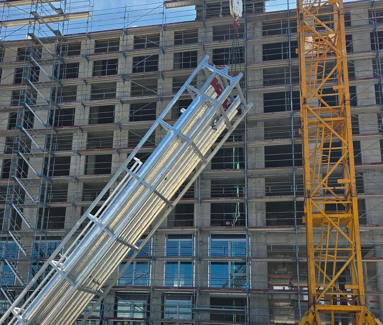 Bei diesem Bauprojekt konnte die Installation der Schächte mit allen Steigesträngen, die normalerweise sechs bis acht Wochen gedauert hätte, auf nur zwei Tage reduziert werden. Grund dafür war die industrielle Vorfertigung der kompletten Schachtkonstruktionen inklusive aller notwendigen Rohrleitungen.