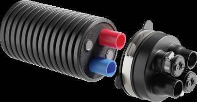 Die Herausforderung erdverlegter Anbindeleitungen von Monoblock-Wärmepumpen löst Viega durch ein neues Systemrohr aus Kunststoff, das mit Raxofix-Übergangsstücken angeschlossen wird: In einem robusten Mantelrohr geschützt und mit hochwertigem Schaumstoff gedämmt, sind zwei Medienrohre aus flexiblem Polybuten (PB) und zwei Leerrohre für Elektroleitungen integriert. Das rote PB-Rohr für den Vorlauf und das blaue für den Rücklauf machen den Anschluss an der Wärmepumpe und den hydraulischen Komponenten im Gebäude verwechslungssicher.