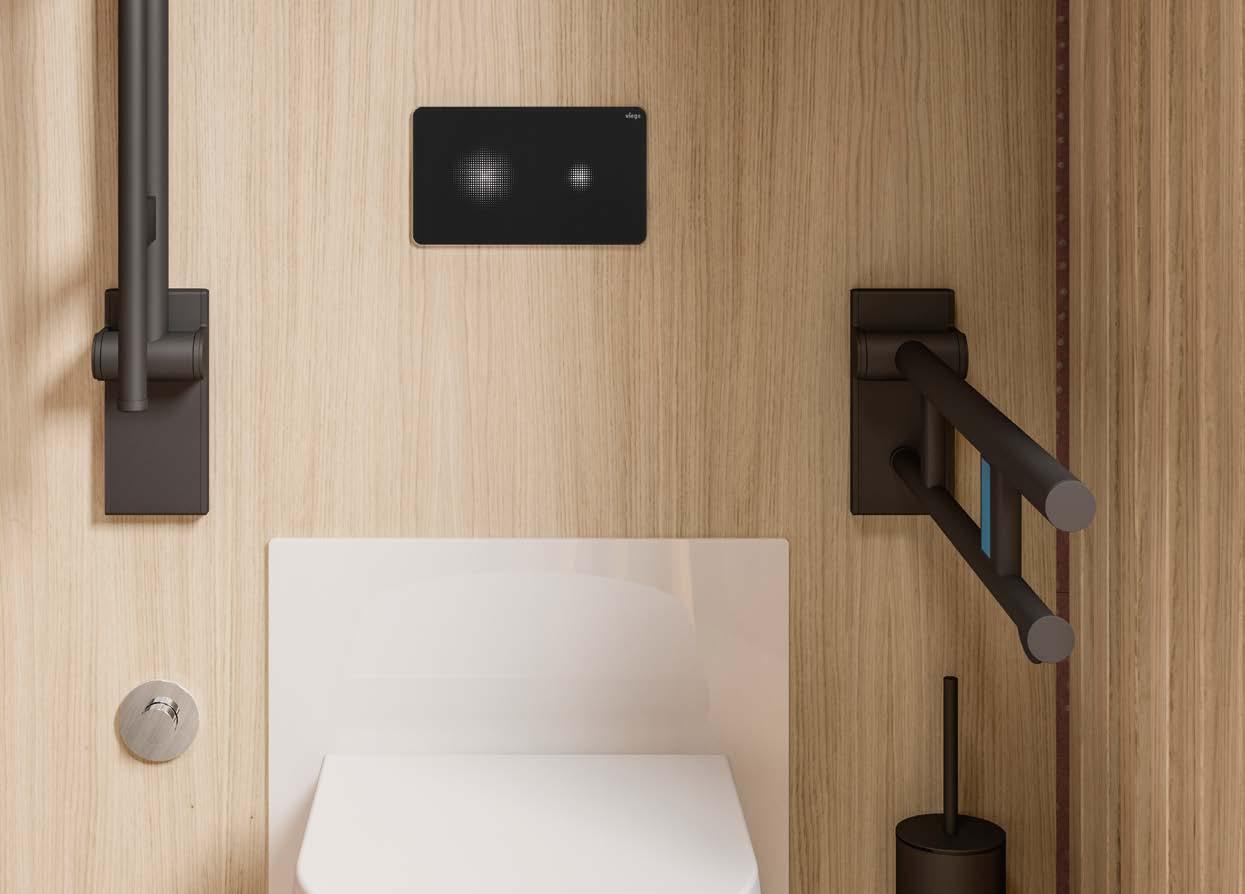 Elektronische Visign-Betätigungsplatten bieten nicht nur innovatives Design, sondern auch eine komfortable Bedienung – je nach Variante durch leichtes Tippen, Drehen oder lediglich eine Annäherung der Hand. Normgerechte Lösungen in puncto Barrierefreiheit sind durch die Kombination mit einer Fernauslösung möglich, die beispielsweise an der gegenüberliegenden Wand oder in Stützgriffen integriert wird.
