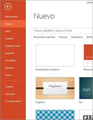 En un extremo de la cinta está la pestaña Archivo, que puede usar para las tareas entre bastidores que suele hacer con un archivo, como abrir, guardar, compartir, exportar, imprimir y administrar la presentación.