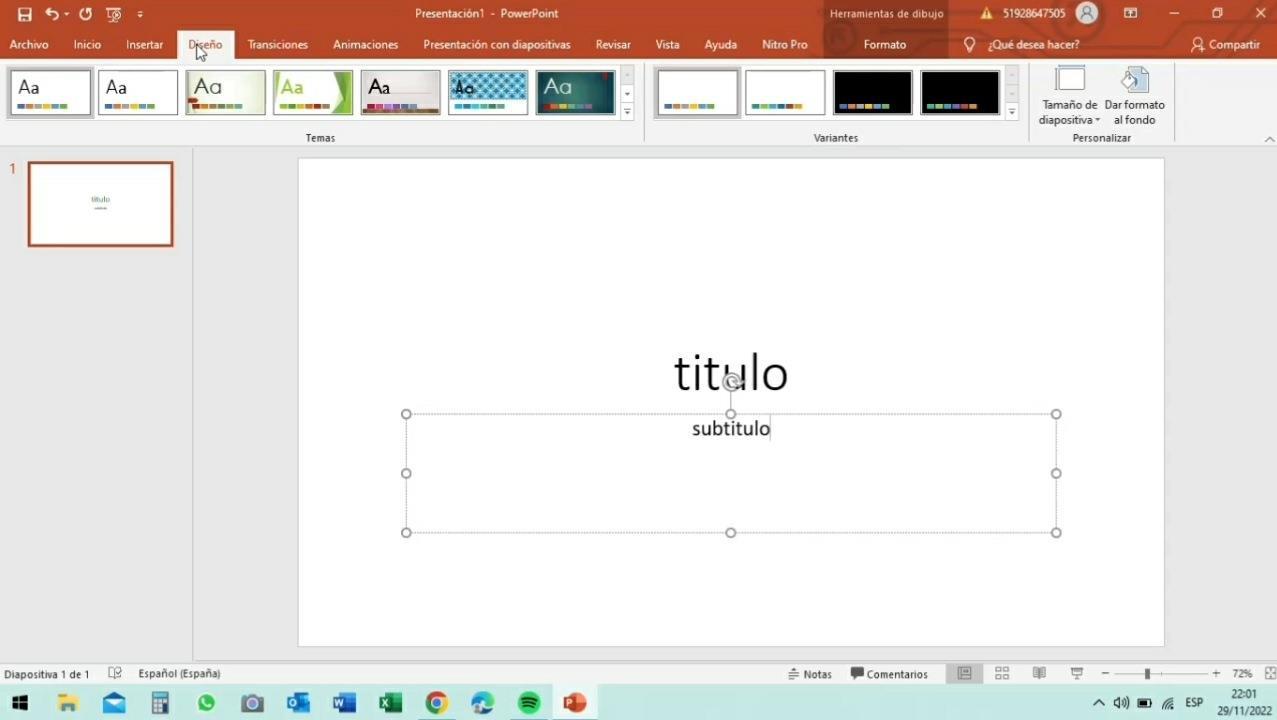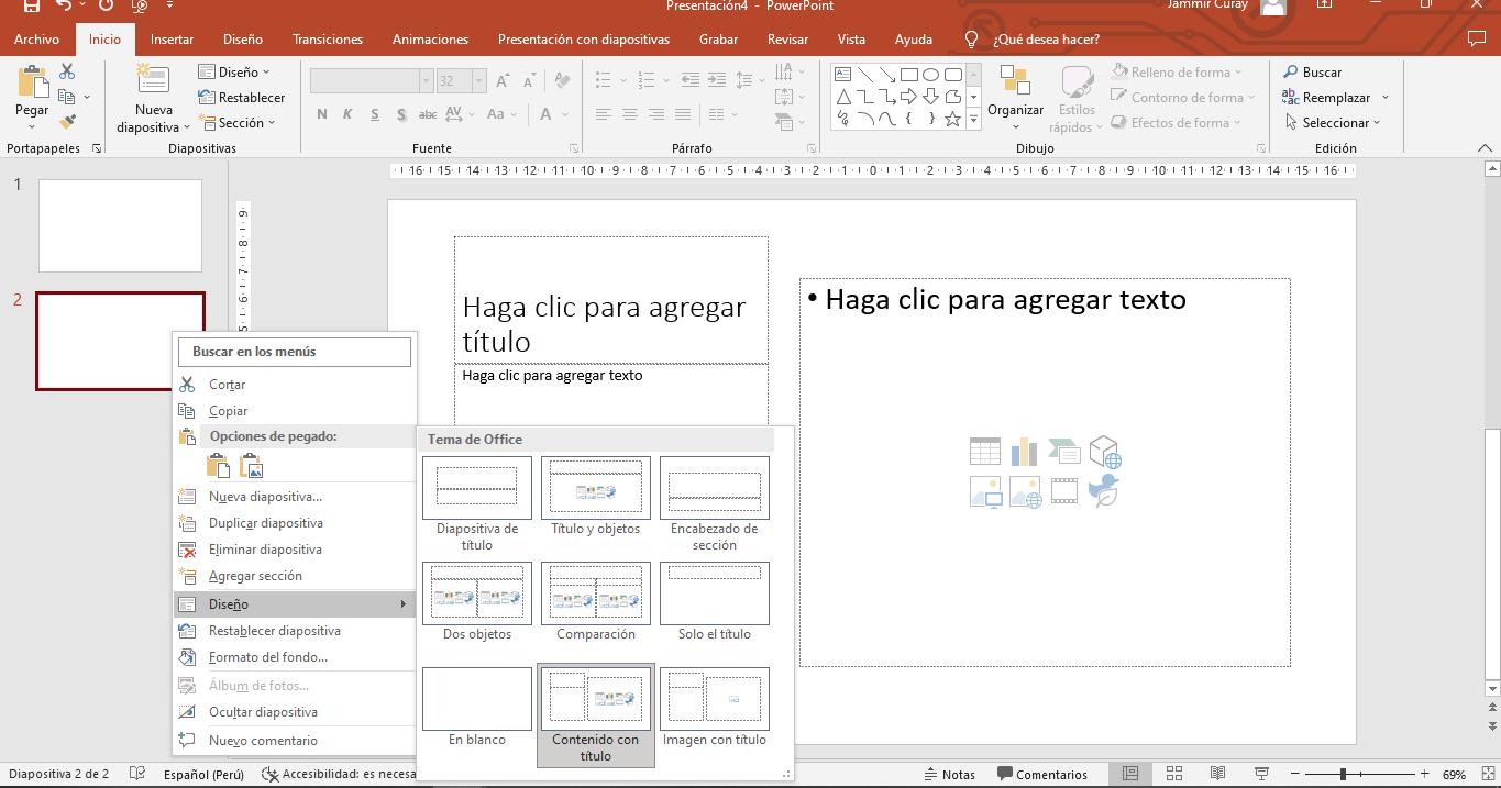 Y si queremos la diapositiva con otro diseño solo tenemos que ir a este apartado: