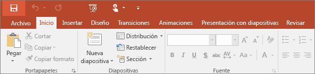 La pestaña Inicio incluye las características Cortar y Pegar, las opciones Fuente y Párrafo, y lo que necesita agregar para organizar las diapositivas.
