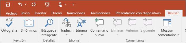 La pestaña Revisar le permite agregar comentarios, pasar el corrector ortográfico o comparar una presentación con otra (por ejemplo, una versión anterior).