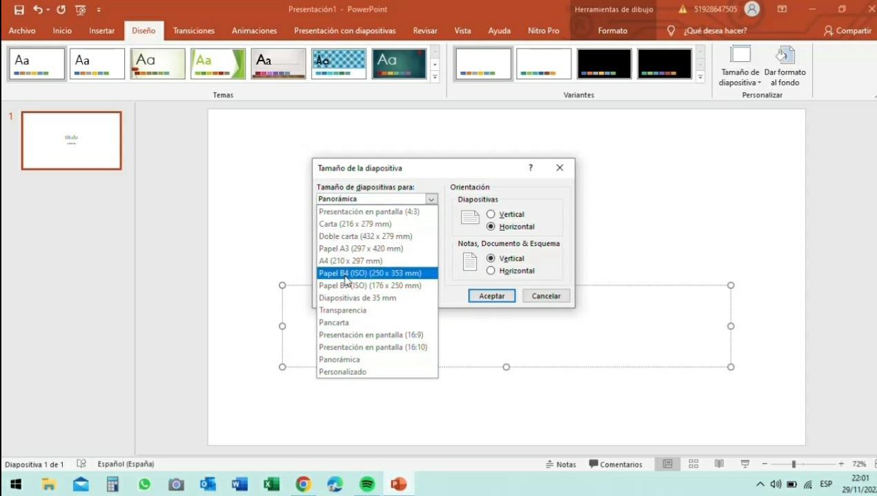 Después de hacerle clic a esta opción, nos aparecerá una ventana , en donde podremos elegir el ancho , el alto , el número y la orientación , de nuestras diapositivas , a continuación hacemos clic, en la opción que se llama , tamaño de diapositivas . en esta opción, encontraremos diferentes tamaños, tales como panorámica , carta , doble carta , papel , etc .