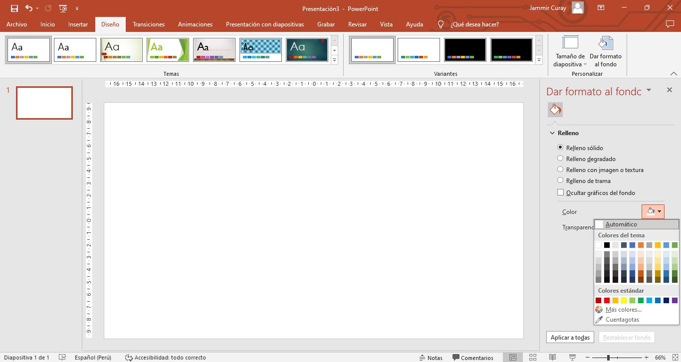 Además, si queremos poner un fondo que no sean los predeterminados de PowerPoint, como un color, nos vamos al apartado de diseño y a formato de fondo tal como se ve en la imagen:
