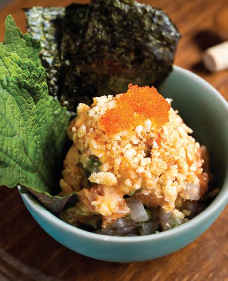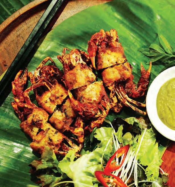 77 「スケッチを見た」と伝えると、ソフトドリン クまたはビールが1杯無料に! 2022年 12/1(木)~12/31(土)まで Roll 「美味しい手巻き寿司が気軽に食べられ る店をつくりたい」という昔からの想いを 形にした「ロール」は、東京・渋谷でボウリ ング場や飲食店などを経営する「笹塚ボ ウル」代表の財津宜史さんが生みの親だ。 店はタオディエンの「おいしいタウン」にあ り、作り置きは一切せず、注文が入ってか ら天ぷらを揚げ、だし巻き卵を焼き、肉を炒 めるやり方を徹底している。 メニューの6割以上を占める巻き料理は、 幅広い食材とソースの独創的な組み合わ せが楽しめる。「ロールタルタル」は、サー モン、マグロ、ホッキガイ、ニシンなど2、3種 類の海鮮を細切りにしてソースと合わせ、 さらにおこげを添える。やわらかな海鮮とカ リカリおこげの食感が新鮮だ。 日本の手巻きずしを フュージョンで進化 プロモーション Promotion ロールタルタル 鰻フォアグラロール OR 伝統的な鰻の巻き寿司から発展させた 「鰻フォアグラロール」は、ソテーした具材 に自家製の豚カツソースとフルーツソース を振りかける。 「私たちの料理は斬新なものが多いので、 食材と味の組み合わせが本当に適切か、 スタッフは何度も試食を繰り返しました」 他所ではなかなかお目にかかれない手 巻き寿司がそろううえ、日本産の米や海苔 を使った風味は本格的だと、ベトナム人は もちろん、欧米、韓国、日本などの外国人 のリピーターが多い。 「エビ天ぷらロール」9万5000VND。食べ応えのあ る2匹のエビに、ワサビマヨネーズソースがぴったり 鰻とフォアグラは、香りが出て柔らかくなるまでソテー。15万VND Oishii Town, 28 Thao Dien St., Thao Dien Ward, Thu Duc 076 425 1078 11:30~14:00 / 18:00~21:30 21:15 なし @rolltemakisushi @roll_vietnam 細かく切った海鮮に 香ばしいおこげをトッピング フォアグラとフライドオニオンで 東西の組み合わせロール 今日のご飯はどっち気分? ROLL ロール 甘辛いソースと混ぜて、シソの葉や海苔で巻いていただこう。9万5000VND