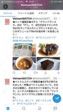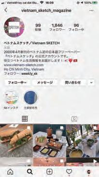 誌面で紹介した特集や新着情報、 コラムなど、全記事をアップ! 在住者・旅行者に分かりやすく 北部、中部、南部と地域ごとに掲載しています。 www.vietnam-sketch.com Website 誌面記事のシェアほか、 タイムリーな最新情報も発信! @vietnam.sketch 毎日更新中! ベトナムの美味しい& 楽しいを写真で紹介! @vietnam_sketch _magazine 友達登録するだけで、 新ネタが手に届く! @ejb7898v 編集部員がつぶやく、 ベトナムの日々。 @vietnamsketch FaceBOOK SKETCH ONLINE MEDIA スケッチ オンラインメディア 各デジタルメディアでも情報を発信中!