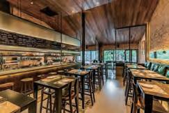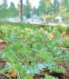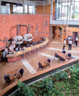 店内の中央にミニガーデンがあり、自然を感じ ながら食事ができるデザイン。内装から小物に至 るまで、可能な限り廃棄されたものを再利用してお り、資源の大切さや環境に優しい取り組みをより 肌で感じられる空間だ。菜園エリアでは、サラダや ピザに使われるロケット、バジル、ケールなどが育て られている。