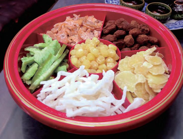 ※記事の情報は2022年11月取材時点のものです ※店舗等の都合や現地情報により内容が異なる場合があります 旧正月は砂糖漬けフルーツで テトのムット 旧正月テト( Tết )にベトナム人の自宅を訪れたことは あるだろうか? どの家庭でも居間のテーブルに、菓 子を盛り付けたおぼんが置かれている。その伝統菓 子はフルーツの砂糖漬け「ムット/ Mứt 」で、おせち 料理のように多くの種類と色、それぞれの意味がある。 最近では新しいフレーバーも登場しているムットで、 旧正月を迎えてみよう。 03