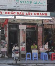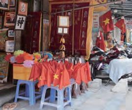 クアンさんがおすすめするのは、堂々とした姿と穏やかな表情のベトナムの神 虎が描かれた版画。「安平小大、家路保護/ An bình tiểu đại, gia lộ hộ bản」と彫られており、家族の大小さまざまな事が順調に進み、全員が守られて 平安であるようにとの願いが込められている ベトナムの家庭の祭壇に使われる祭祀用具が揃う。とくに、仏壇、木製の写 真立て、龍を描いた磁器の香炉が多い ハンクアット通りには印鑑専門店「フックロイ/ Phúc Lợi」があり、多くの日本 語ガイドブックで紹介されている。日本人の名前が刻まれた印鑑がたくさん 一般的な冠婚葬祭で使われる旗のほかに、最近では小さなベトナム国旗も販 売されており、観光客に人気だそうだ