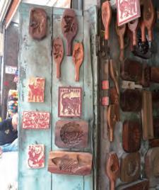 木型の製作は、木材選びも大切。柔らかすぎると模様がすり減り、硬すぎると 型が欠けやすくなる。柔らかすぎず硬すぎず、ちょうど良いバランスを保ってい るアシュ(Xà Cừ)やカバイロクロガキ(Thị)を使用する。店の壁には様々な木 型がぎっしりと展示されている