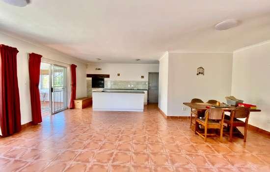 Open plan kitchen and living room giving the house the perfect flow. Double garage that leads into a courtyard with an outside braai area and off-street parking for 3 vehicles Borehole with pump to fill up the swimming pool and water the garden
