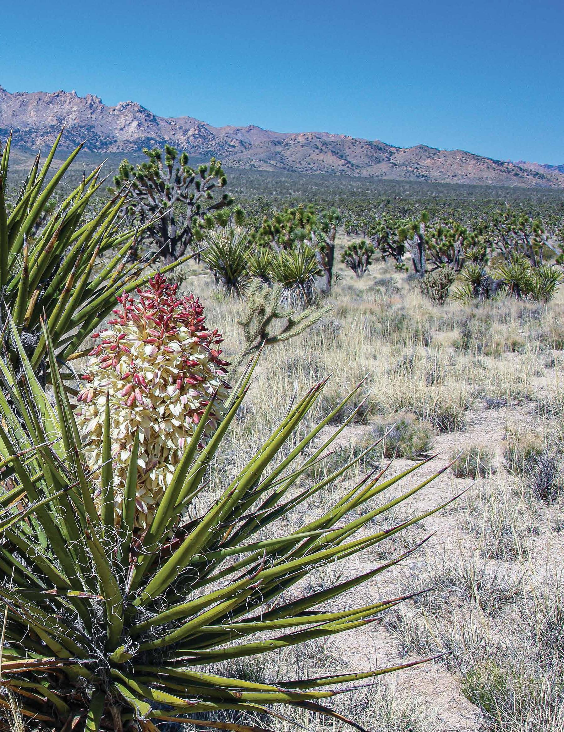 Our tour begins at the Cima Road exit on I-15. From the off-ramp, reset your trip meter to zero, and head south. Soon you’ll be climbing a very gradual hill as you watch the Joshua trees around you become thicker and thicker. At about the seven to eight-mile mark, you’ll begin to see the fire damage, first on one side of the road, and then on both sides. At the 10-mile mark, look for a well-defined dirt road that leads to the right (west). This is the road to the historic Valley View Ranch.