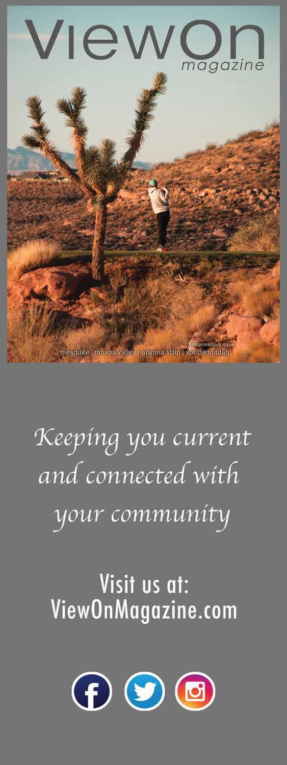 Aguilar Mobile Carwash 100 All Secure Storage, LLC . . . . . . . . . . . . . . . . . . . . . . . . . . . . 88 Aravada Springs . . . . . . . . . . . . . . . . . . . . . . . . . . . . . . . . 86 Arizona Horse Ride 41 Budget Blinds . . . . . . . . . . . . . . . . . . . . . . . . . . . . . . . . . 48 C & J Shutters, Blinds and Flooring . . . . . . . . . . . . . . . . . . . 100 Checks-N-Mail 100 Conestoga Golf Club 1880 Grille . . . . . . . . . . . . . . . . . . . . . . 90 Coyote Willows Golf Course 92 Deep Roots Harvest Inside Back Cover Desert Damon Photography . . . . . . . . . . . . . . . . . . . . . . . . 72 Desert Oasis Spa and Salon 67 Desert Pain Specialists 23 ERA - Natalie Hafen . . . . . . . . . . . . . . . . . . . . . . . . . . . . . . 14 ERA - Sharon Szarzi 86 Eureka Casino Resort - Auntie Anne's / Cinnabon IFC Eureka Casino Resort - William Hill Sportsbook . . . . . . . . . . . 47 Farmers Insurance - Bill Mitchell 17 Friends of Gold Butte 100 Great Clips . . . . . . . . . . . . . . . . . . . . . . . . . . . . . . . . . . 100 H&R Block 59, 75 Hangey's Custom Upholstering 100 Heavenly Gift Shoppe . . . . . . . . . . . . . . . . . . . . . . . . . . . . 82 HedgeHog Electric and Solar 100 Hole Foods Bakery 18 Intermountain Golf Cars . . . . . . . . . . . . . . . . . . . . . Back Cover J.R. Morgan Glass & Glazing, LLC 101 JSL Iceberg Air Conditioning & Heating . . . . . . . . . . . . . . . . 100 Judi Moreo – Speaker, Author, & Coach . . . . . . . . . . . . . . 80, 101 Juniper Outpost 99 Kayenta Arts Foundation . . . . . . . . . . . . . . . . . . . . . . . . . . 69 Ken Garff Mesquite Ford - Dave Heath . . . . . . . . . . . . . . . 91, 101 Kirton | McConkie Law Firm 57 Kitchen Encounters . . . . . . . . . . . . . . . . . . . . . . . . . . . . . . 65 Medicare and Healthcare Insurance - Mary Bundy . . . . . . . . . . 77 Mesa Valley Estates Assisted Living and Memory Care 56 Mesa View Regional Hospital . . . . . . . . . . . . . . . . . . . . . . . . 59 Mesquite Branding and Design 101 Mesquite Department of Athletics and Leisure Services 7 Mesquite Fine Arts Center and Gallery 101 Mesquite Lumber / Ace Hardware 73 Mesquite Senior Games . . . . . . . . . . . . . . . . . . . . . . . . . . . 70 Mesquite Tile and Flooring 34 Mesquite Veterinary Clinic - Peggy Purner, DVM 72 MINA Boutique . . . . . . . . . . . . . . . . . . . . . . . . . . . . . . . . 31 Mortgage Mate, LLC 45 Mr. Silverado's Shack 101 MVP Productions . . . . . . . . . . . . . . . . . . . . . . . . . . . . . . 101 Nevada Bank and Trust 17 Oasis Golf Club 96 Odyssey Landscaping, Inc . . . . . . . . . . . . . . . . . . . . . . . . . 101 Oral & Facial Surgery Center of Mesquite 1 P3 Medical Group 81 Polynesian Pools. . . . . . . . . . . . . . . . . . . . . . . . . . . . . . . 102 Preston's Medical Waste & Shredding 98 Ready Golf Cars . . . . . . . . . . . . . . . . . . . . . . . . . . . . . . . . 96 RealtyOneGroup - Beverly Powers Uhlir . . . . . . . . . . . . . . . . . 71 RealtyOneGroup - Deb Parsley 43 Red Rock Golf Instruction - Rob Krieger . . . . . . . . . . . . . . . . 102 Reliance Connects . . . . . . . . . . . . . . . . . . . . . . . . . . . . . . 75 Re/Max Ridge Realty – Dave Neufeld 60, 61 Richens Eye Center . . . . . . . . . . . . . . . . . . . . . . . . . . . . . . 97 Rooster Cottage Consignment Gallery 80 Silver Rider 78 SnapShots West Photography . . . . . . . . . . . . . . . . . . . . . . 102 Southern Nevada Symphony Orchestra 41 St. George Regional Airport 51 St. George Surgical Center . . . . . . . . . . . . . . . . . . . . . . . . . 83 State Farm - Lisa Wilde 89 STORE MORE! Self Storage 34 TDS Telecom . . . . . . . . . . . . . . . . . . . . . . . . . . . . . . . . . . 77 The Lindi Corp 98 Tuacahn Amphitheatre 32 Vape On State . . . . . . . . . . . . . . . . . . . . . . . . . . . . . . . . . 94 WaFd Bank 93 Warmington Group Desert Ridge - Beverly Rineck 85 Washington County Fair . . . . . . . . . . . . . . . . . . . . . . . . . . 10 Yogi Window Cleaning 102