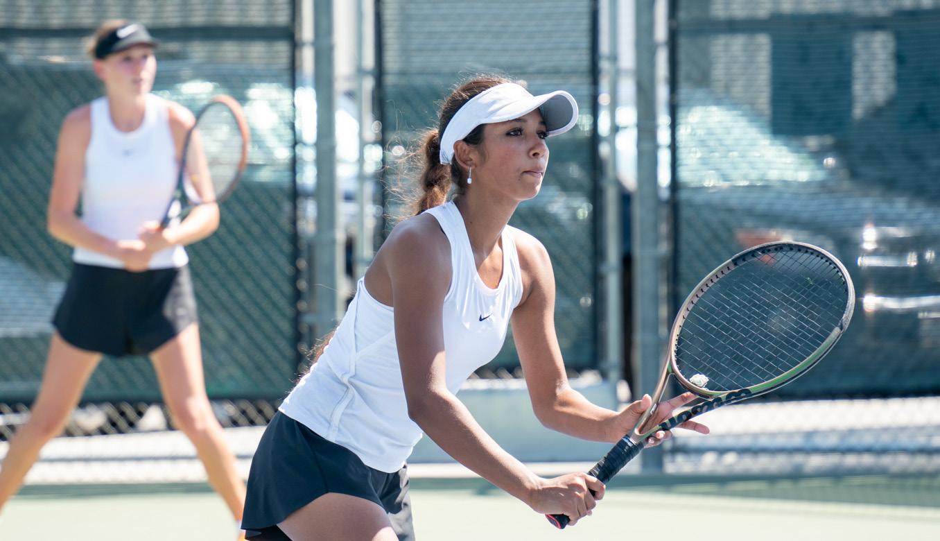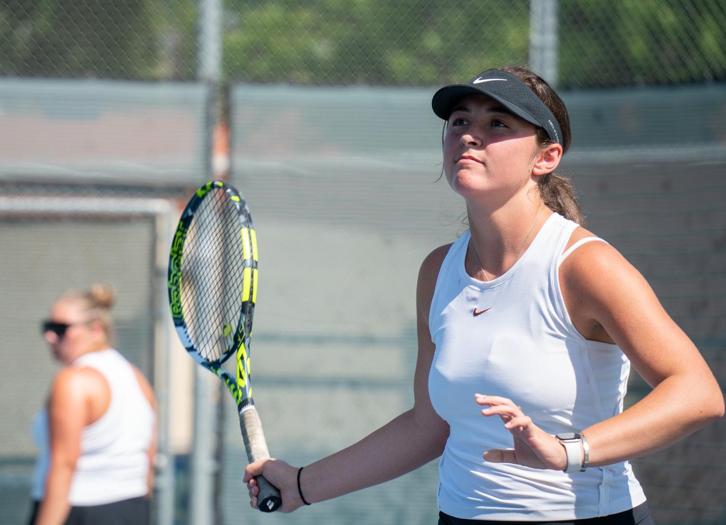 Doubles play started with Victoria Herrera and Brianna Nikas, who finished first with an 8-1 win. Sisters Angelina Capraro and Julianna Capraro followed with an 8-3 victory, and Fullerton defaulted the third doubles match due to unavailable players, giving the Tigers a 3-0 lead.
