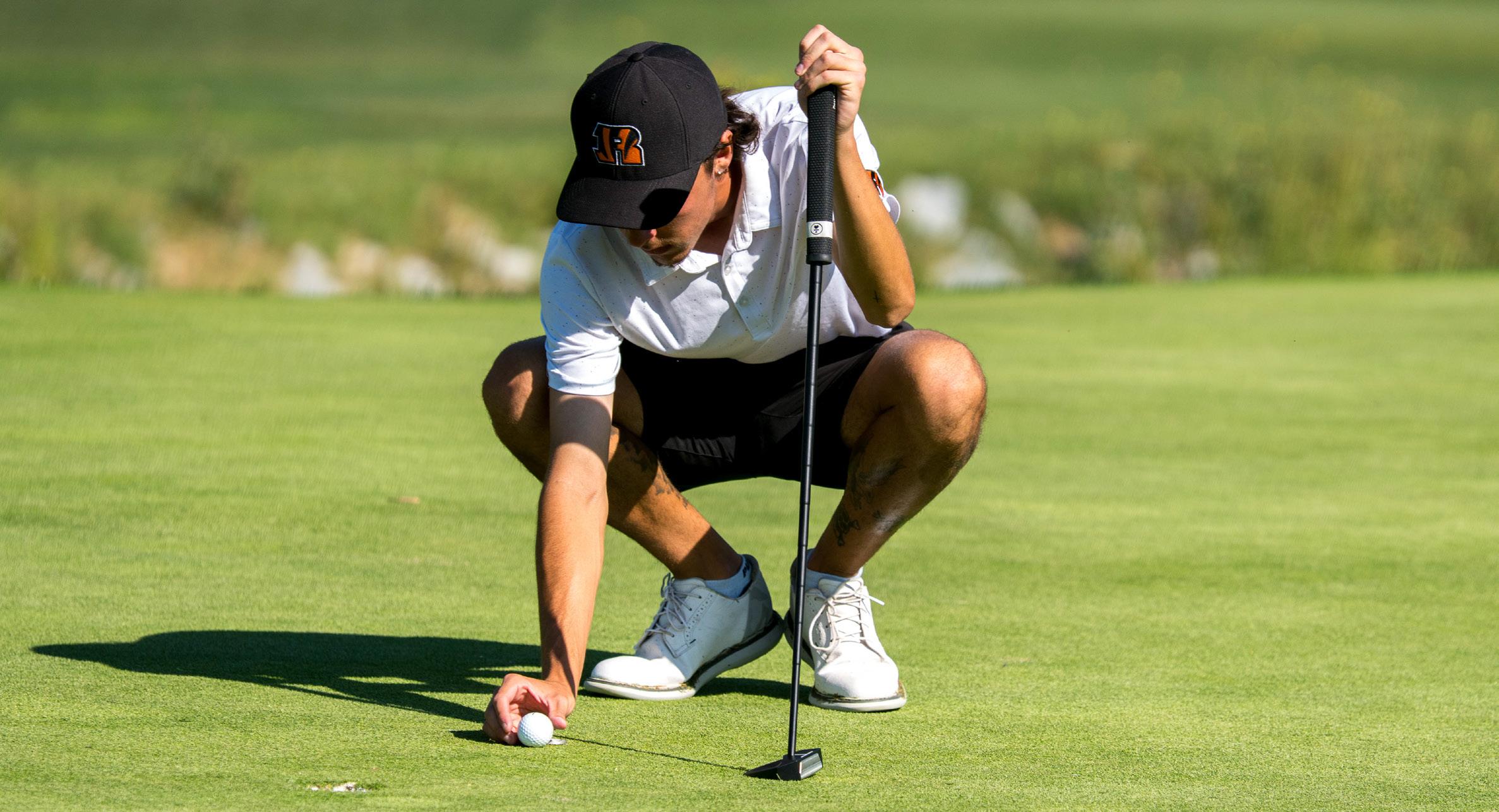 Riverside City College golfer, Elijah Gonzales, places his ball on a marker during match on March 23.