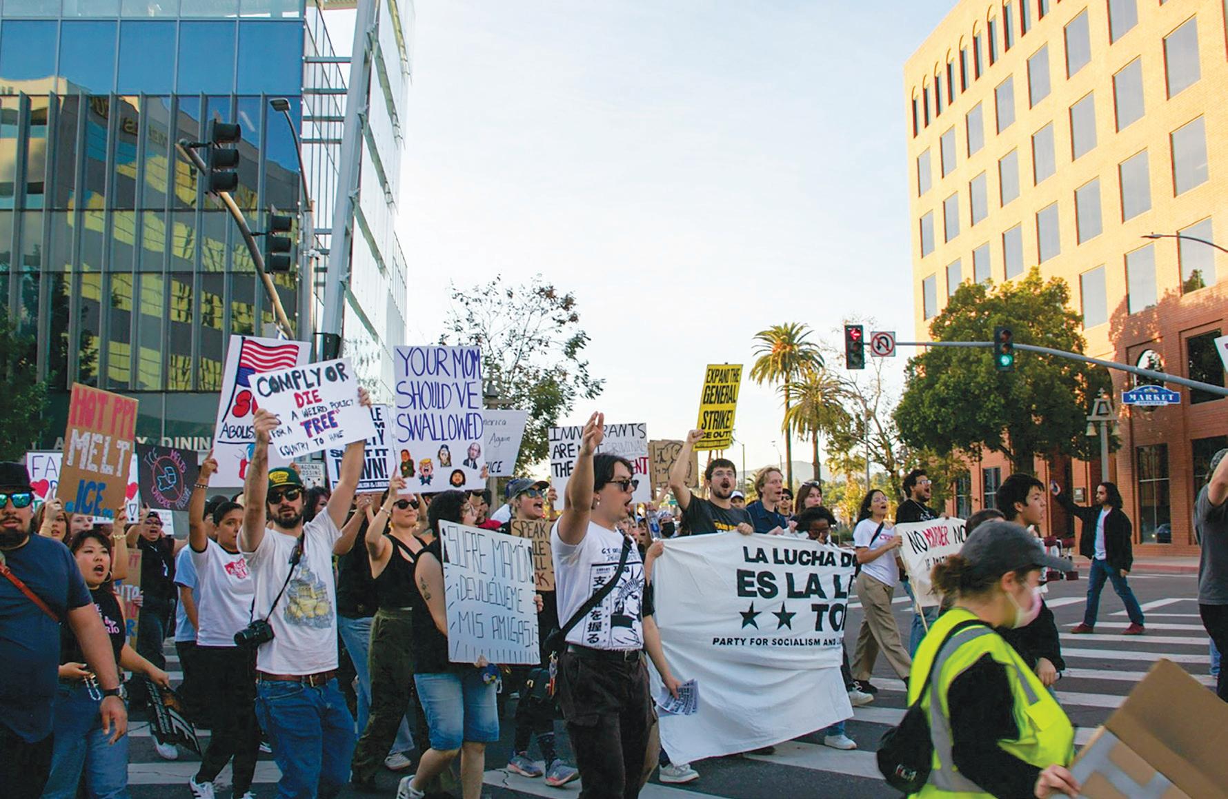 About 1,000 anti-ICE protestors marched through the streets of downtown Riverside on Jan. 30 during a national day of action. Minnesota protestors called for the strike and shutdown after the recent displays of violence from federal immigration agents in their state.
