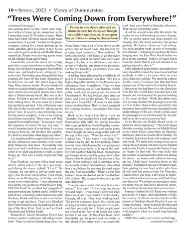 continued from page 10 Road had three trees across their driveway, “not huge trees, but until we could cut these up by hand with our bow saw, the plowing couldn’t happen. And the plowing couldn’t happen until GMP opened up Partridge Road after three to four days of our nine homes being landlocked by downed trees and wires. We all made it through intact, and it was beautiful and the weather, thankfully, was quite warm post-storm.”