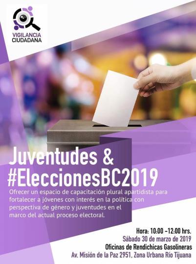 El Taller Juventudes y #EleccionesBC2019 se realizó el día 30 de marzo en la oficina de RendiChicas, Zona del Río, Tijuana, con una duración de 2 horas, impartido por Magaly Preciado, Yair Hernández y Cheryl Álvarez. Los temas que se vieron fueron: el proceso electoral, la perspectiva de género, la perspectiva de juventudes y recomendaciones para la participación en el proceso electoral. Tuvo la participación de 14 jóvenes, 58% fueron mujeres y 42% hombres.