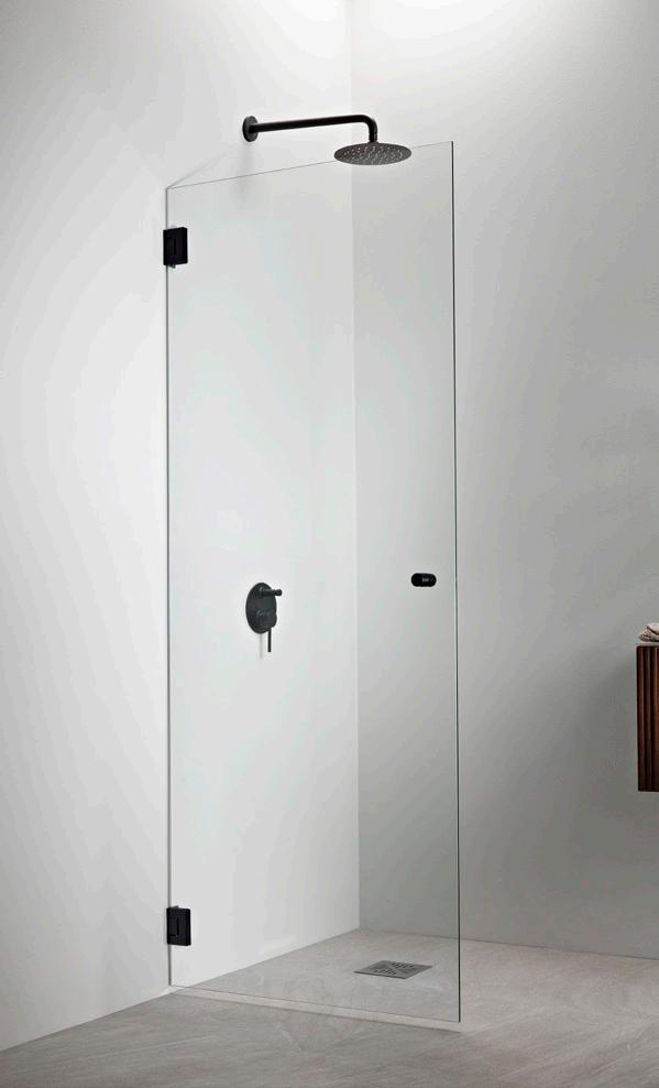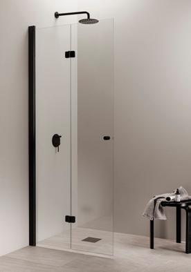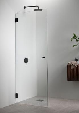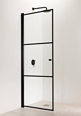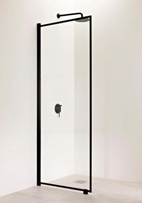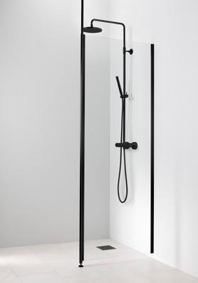 ELEGANCE 1 kiinteä suihkuseinä. Kuvassa mustilla heloilla ja kirkkaalla lasilla 520 €.