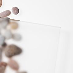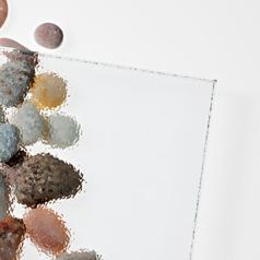 Läpinäkyvä kirkas lasi, jonka toinen puoli on pinnaltaan koristeellinen ja toinen sileä.