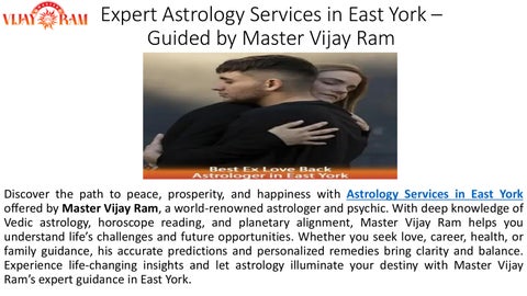 Discover the path to peace, prosperity, and happiness with Astrology Services in East York offered by Master Vijay Ram, a world-renowned astrologer and psychic. With deep knowledge of Vedic astrology, horoscope reading, and planetary alignment, Master Vijay Ram helps you understand life’s challenges and future opportunities. Whether you seek love, career, health, or family guidance, his accurate predictions and personalized remedies bring clarity and balance. Experience life-changing insights and let astrology illuminate your destiny with Master Vijay Ram’s expert guidance in East York.