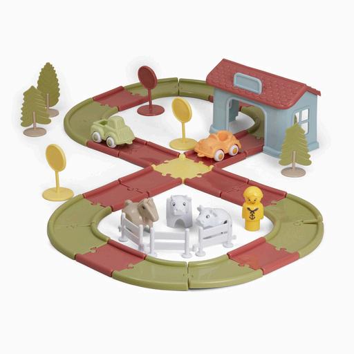 Inkluderande 2 bilar, 3 djur, 3 skyltar, 1 staket, 1 bonde, 3 träd, 1 affär och 25 vägbitar