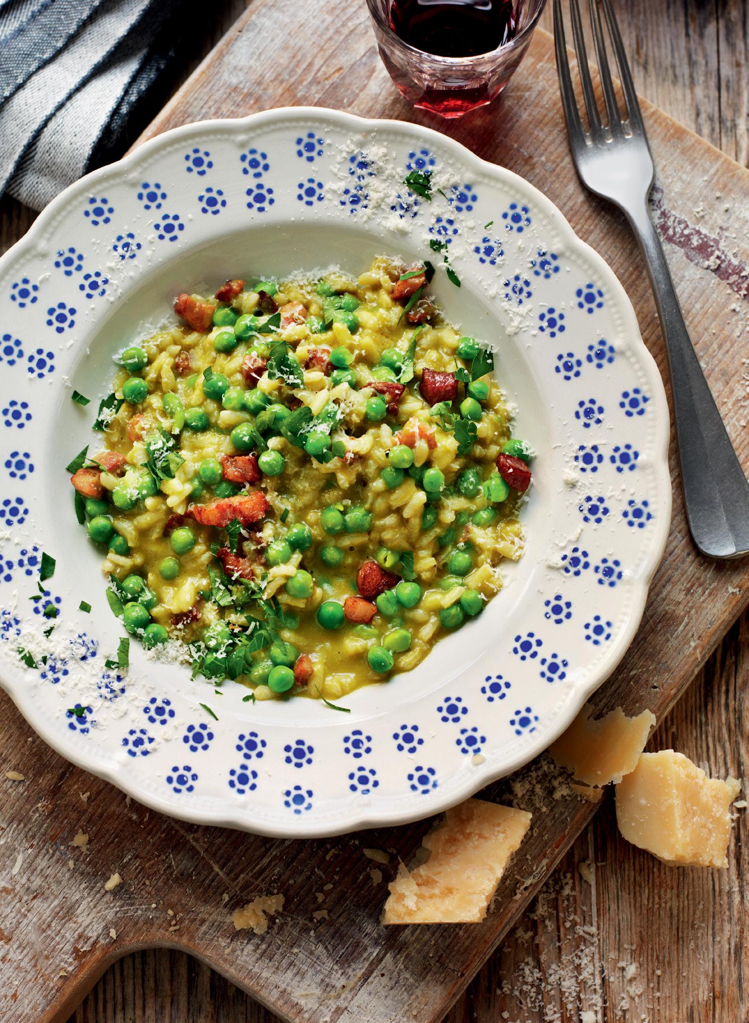 2 ¾ pints (1.3 litres) vegetable stock 2 lb (900g) fresh peas 2 oz (60g) butter 1 onion, finely chopped 1 ¾ oz (50g) pancetta 12 ½ oz (355g) risotto rice 1 ¾ oz (50g) Parmesan cheese 2 tbsp fresh parsley, chopped Contessa Passi taught me how to cook this dish in her beautiful Palazzo Tiepolo on the Grand Canal in Venice. Literally ‘rice and peas’, this classic Italian dish is much easier and less time consuming to make than a risotto. If you can’t find fresh peas, use good quality frozen ones instead.
