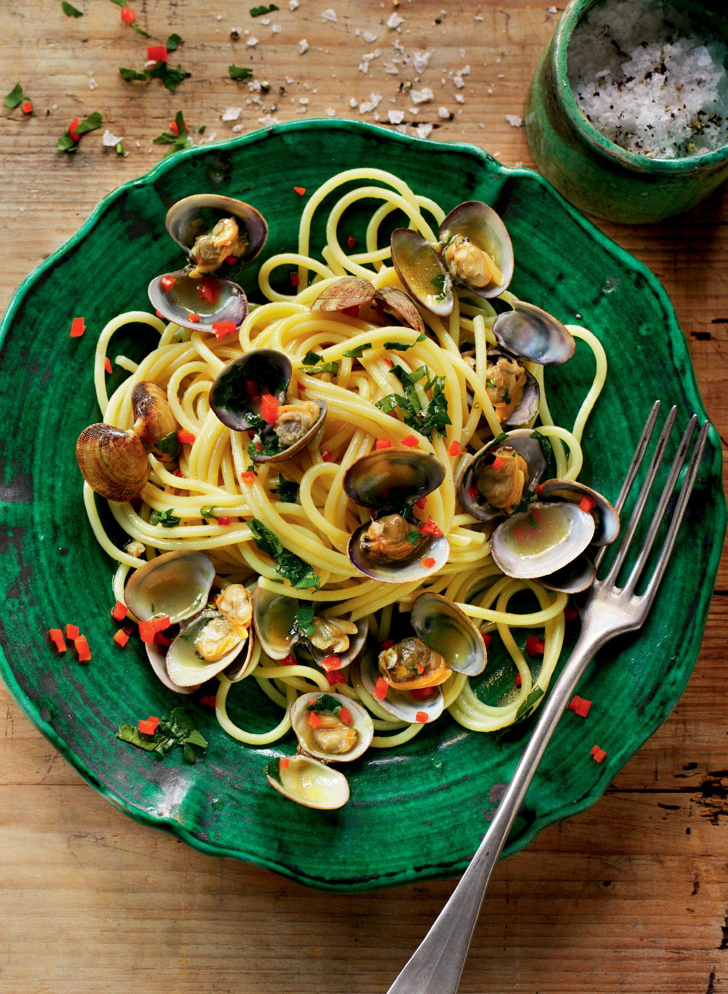1 lb (450g) fresh clams 2 tbsp olive oil 1 clove garlic 1 tsp red chilli, finely chopped 2 fl oz (60ml) white wine 1 tsp salt Pinch pepper 1 lb (450g) dried spaghetti