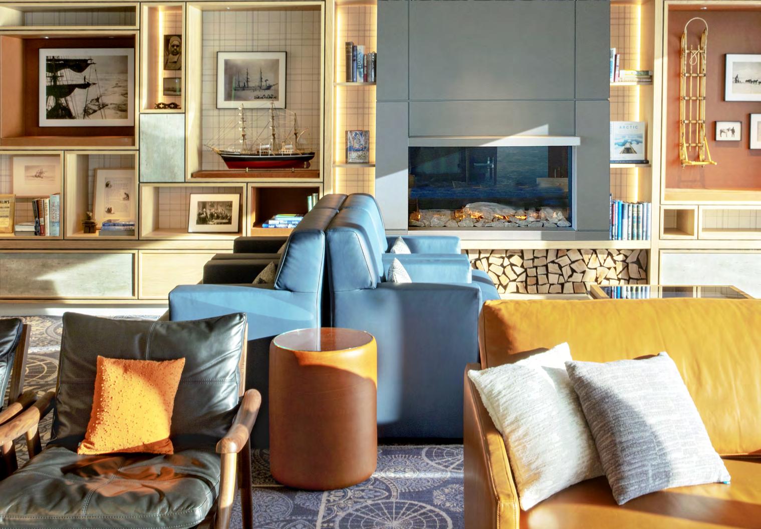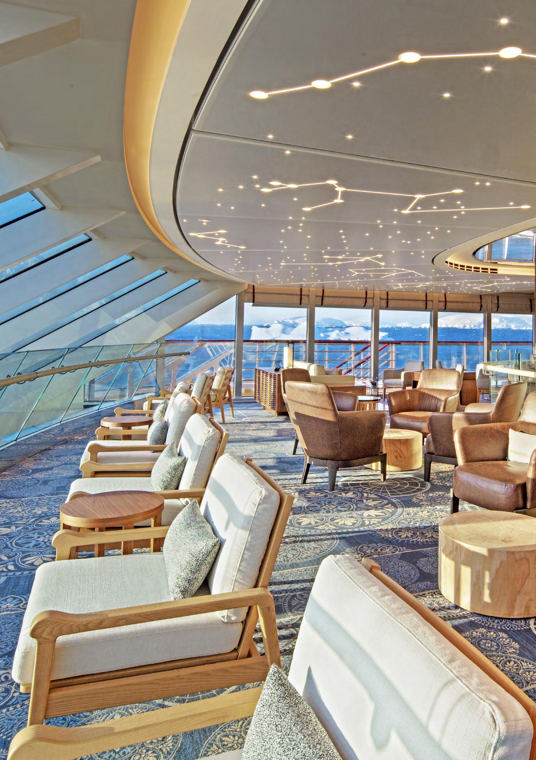 This panoramic auditorium, inspired by the University of Oslo’s ceremonial hall, is your central hub for intellectual enrichment. You can attend a variety of lectures, daily briefings, documentaries and films about your destination. The Aula features a state-of-the-art 4k laser-projected screen that retracts to reveal floor-to-ceiling windows, offering 270° views of the surrounding seascape. This space is perfect for absorbing the rich history and scientific knowledge shared by onboard experts.
