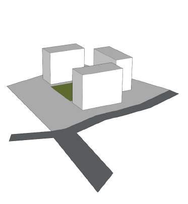 There are two existing trees on the site which are diagonal to each other. A four block cluster of the built is formed around the trees.