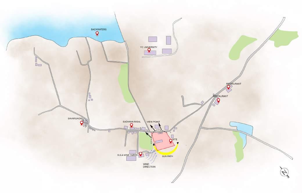 The site is surrounded by existing school, and the Maheshwar fort area on the south side. There is only one primary adjacent road from with the main entrace has been taken.