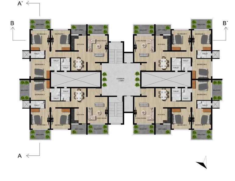 Every set of five floors consists of two floors with 3 BHK flats. The residences have balconies facing towards the view of the mountain, also providing proper light and ventilation.