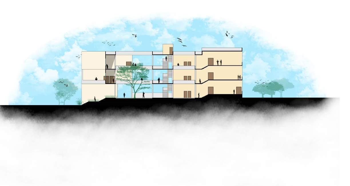 A ‘C’-shaped form placed on the site such that it faces towards the view of the mountain. A central open space acts as a recreational area .