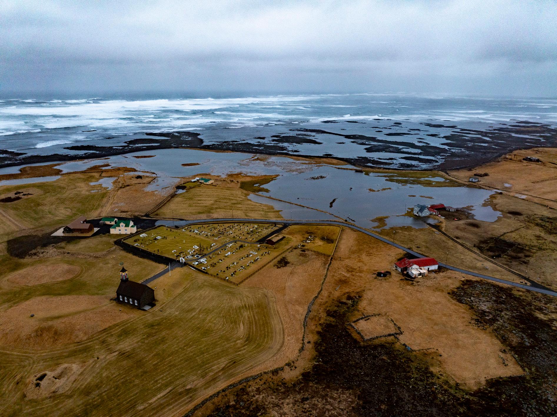 Frá flóðasvæði við Hvalsnes í byrjun marsmánaðar í fyrra, 2025. VF/hilmarbragi
