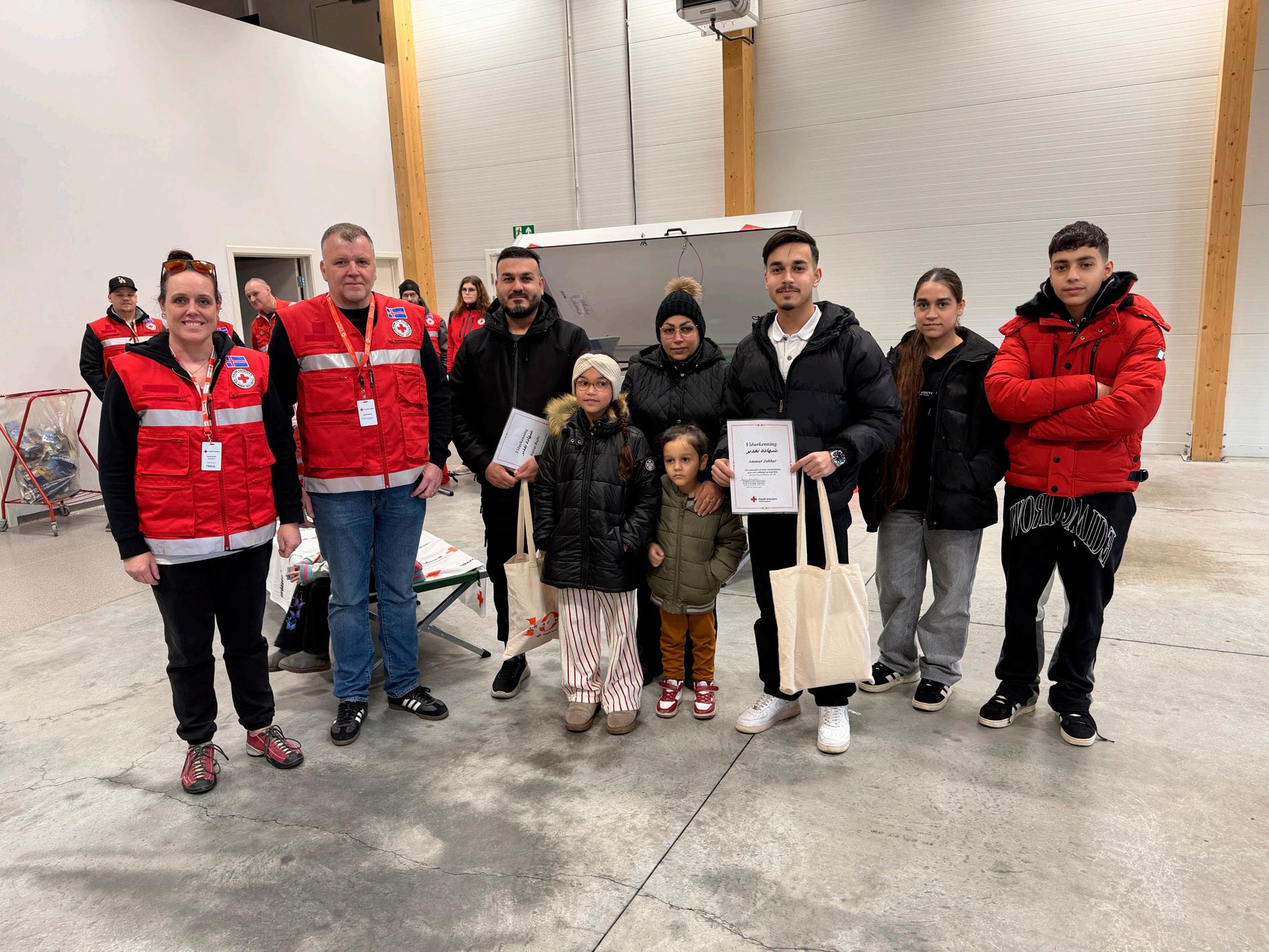 Helena Björk Rúnarsdóttir, fulltrúi Rauða krossins í aðgerðastjórn neyðarvarna á Suðurnesjum, og Guðbergur Reynisson, verkefnastjóri neyðarvarna hjá Suðurnesjadeild Rauða krossins, ásamt feðgunum Karrar og Ammar og fjölskyldu þeirra á 112-deginum í Reykjanesbæ þar sem þeim var afhent viðurkenningin.