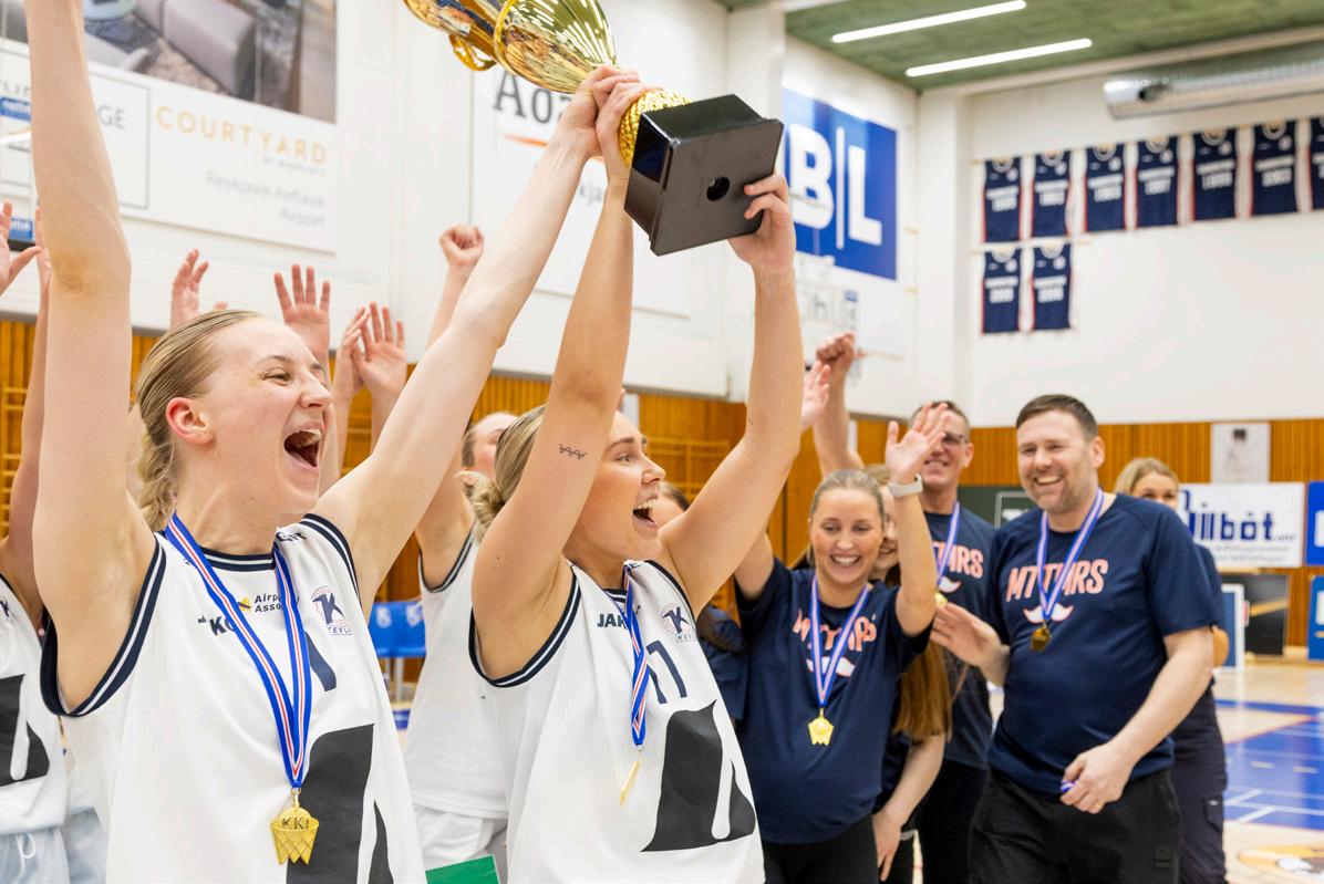 Að ofan fagna deildarmeistarar Keflavíkur titlinum. Til hliðar eru mæðgurnar og stórskytturnar Björg Hafsteinsdóttir og Thelma Dís Ágústsdóttir. Björg er nýtekin við sem formaður Keflavíkur, íþrótta­ og ungmennafélags, og þetta er fyrsti titilinn sem kemur í hús í embættistíð hennar.