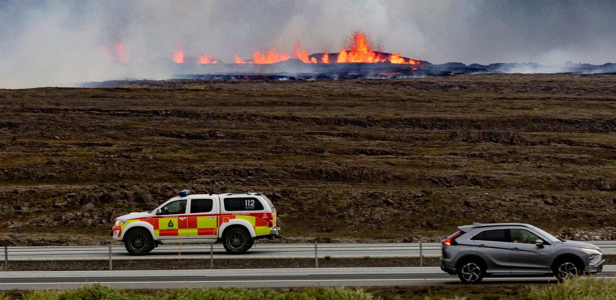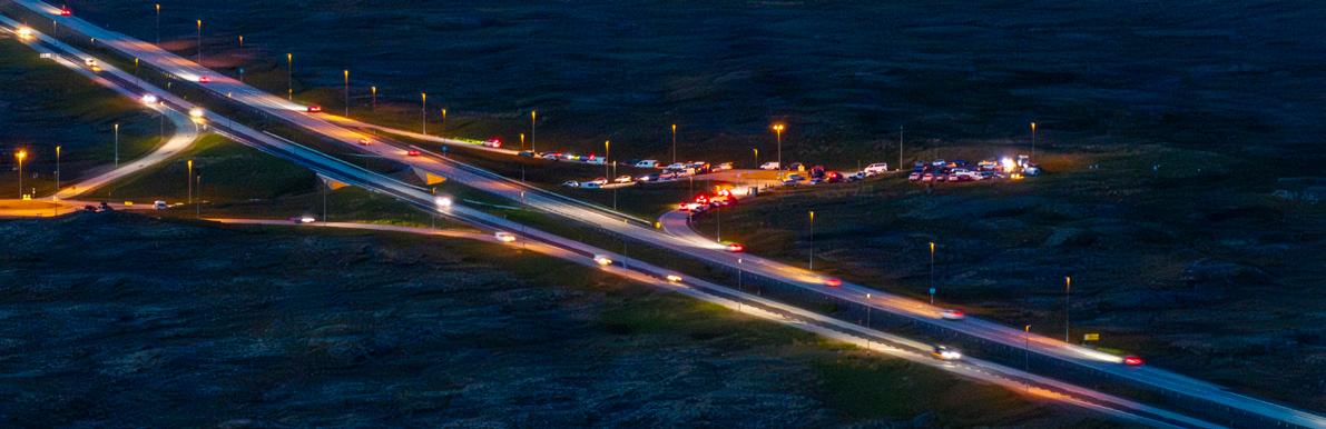 gasmengun og jarðskjálftum á Sundhnúkagígaröðinni. Svæðið þar sem nú gýs norðaustur af StóraSkógfelli fellur undir þessa viðvörun. Hættumat fyrir Grindavík hefur verið lækkað. Níunda eldgosið á Reykjanesskaga frá árinu 2021 hófst sl. fimmtudagskvöld, 22. ágúst á Sundhnúkagígaröðinni. Það er jafnframt sjötta gosið á þeirri gígaröð. Nú gýs nyrst á gossprungunni sem alls náði að verða sjö kílómetra löng, þó ekki hafi gosið á allri sprungunni samtímis. Yfirstandandi gos er á þeim hluta sprungunnar sem opnaðist nokkrum klukkustundum eftir að gosið kom fyrst upp. Á myndinni má sjá líflega kvikustróka eins og þeir blöstu við vegfarendum um Reykjanesbraut síðasta föstudag. VF/Hilmar Bragi