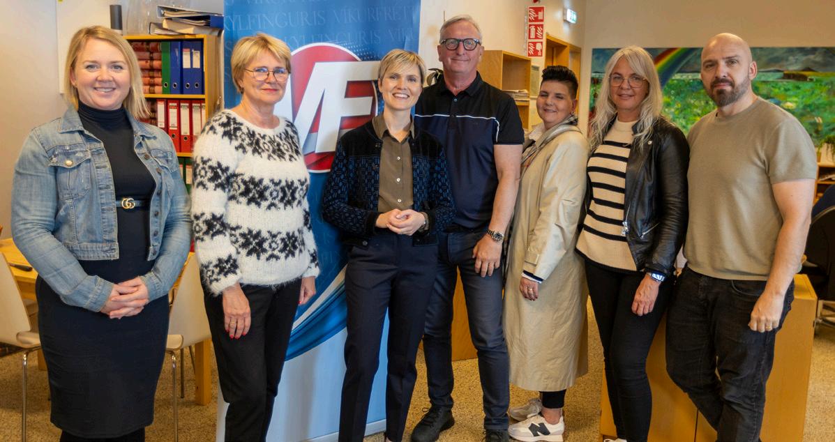 Samfylkingarheimsókn F.v. Guðný Birna Guðmundsdóttir, forseti bæjarstjórnar Reykjanesbæjar, Oddný Harðardóttir, þingmaður, Kristrún Frostadóttir, formaður Samfylkingarinnar, Páll Ketilsson, ritstjóri VF, Aðalheiður Hilmarsdóttir og Sigurrós Antonsdóttir varabæjarfulltrúar og Sverrir Bergmann, bæjarfulltrúi. VF/Hilmar Bragi