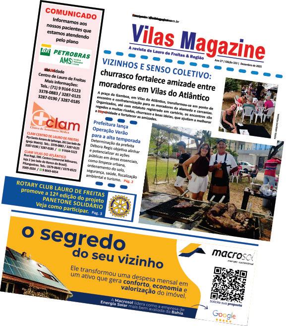 Publicação mensal de propriedade da EDITAR - Editora Accioli Ramos Ltda. Av. Praia de Pajussara, n° 294, Vilas do Atlântico, Lauro de Freitas. Bahia. CEP 42708-720. Tel.:/Whatsapp: 71 9 8899-2439. Diretor-Editor: Carlos Accioli Ramos (diretoria@vilasmagazine. com.br). Diretora: Tânia Gazineo Accioli Ramos. Gerente de Negócios: Álvaro Accioli Ramos (comercial@vilasmagazine.com.br). Gerente de Produção e Distribuição: Thiago Accioli Ramos. Financeiro: Miriã Morais Gazineo (financeiro@vilasmagazine.com.br). Tratamento de imagens e CTP: Diego Machado. Redação: Thiara Reges (jornalista freelancer). Colaboradores: Hendrik Aquino, Paulo Maneira, Cláudia Correia, Márcio Wesley. Tiragem desta edição: 15 mil exemplares Impressão: OESP Gráfica (SP).