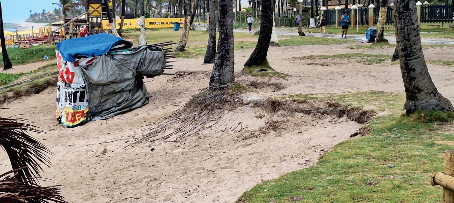 O Projeto Plantar, parceria da SALVA com a Prefeitura, visa plantar 200 mudas de coqueiros na orla de Vilas do Atlântico (foto acima), com o propósito de conter a destruição do gramado que margeia o calçadão, por barracas irregulares que se instalam na área (50% do gramado da orla já foi arrancado, como mostra a foto abaixo).